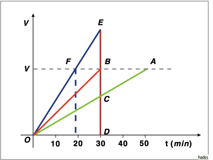 Ein Wasserbehälter mit dem Inhalt V kann durch eine Punpe A in 50 Minuten entleert werden. Eine Pumpe B braucht dazu 30 Minuten. In welcher Zeit wird der Wasserbehälter geleert, wenn beide Pumpen laufen?